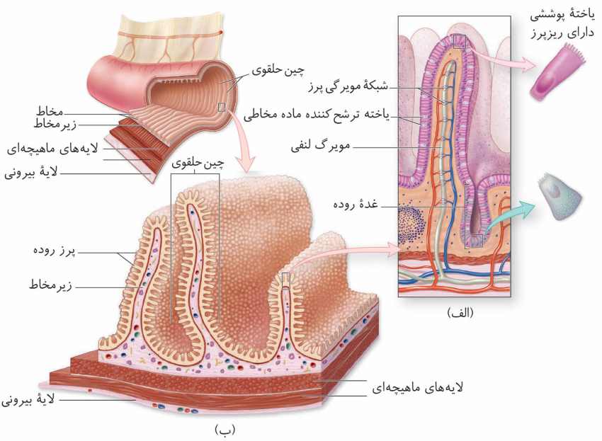 پ. فقط بعضی از عواملی که سطح داخلی روده را چندین برابر افزایش میدهند فاقد ماهیچههای لایه ماهیچهای دیوارهاند.