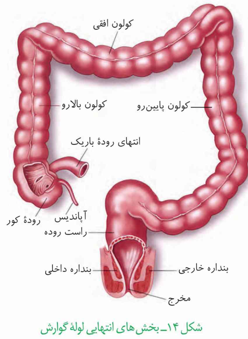 ح. در روده بزرگ آب و یونها جذب میشود و نهایتا در راست روده مدفوع به شکل جامد درمیآید.