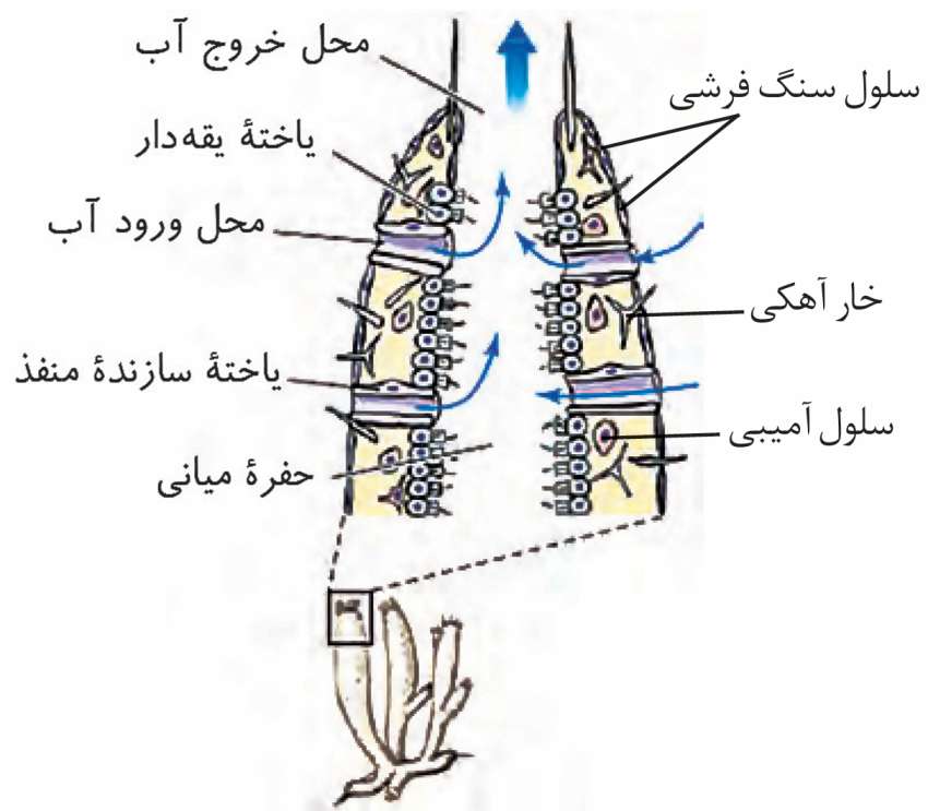 در اسفنجها آب از محیط بیرون از طریق سوراخهای دیواره به حفره یا حفرههایی وارد و پس از آن از سوراخ یا سوراخهای بزرگتری خارج میشود.