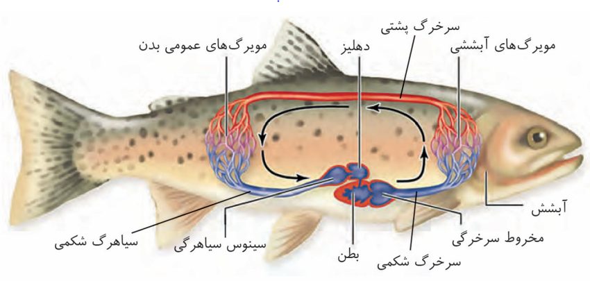 حرکت خون در سطح پشتی ماهی از سر به انتها و در سطح شکمی از انتها به سر است.