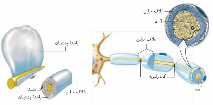 حالا که میدانیم نورون از چه بخشهایی تشکیل شده با دو مفهوم جدید آشنا میشویم: رشته عصبی و غلاف میلین.