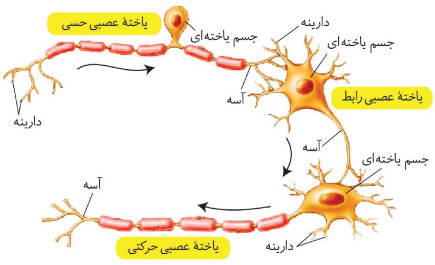هر نورون از سه بخش تشکیل شده است: دندریت، جسم سلولی و آکسون.