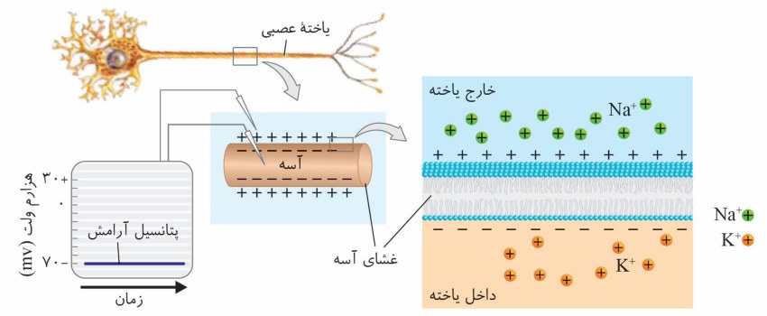 در حالت آرامش مقدار یونهای سدیم در بیرون سلول عصبی زنده از داخل آن بیشتر است و در مقابل مقدار یونهای پتاسیم درون سلول از بیرون بیشتر است.