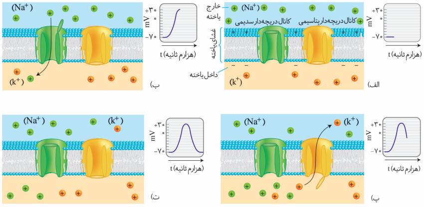 ج. پس از باز شدن کانالهای دریچهدار پتاسیمی، همزمان با کاهش یونهای مثبت درون سلول، اختلاف پتانسیل درون و بیرون غشا همواره کاهش مییابد.