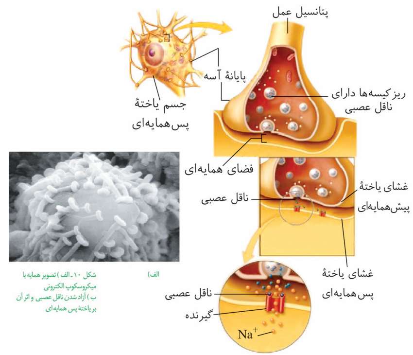 چ. دقت کنید در انتقال پیام عصبی ناقل وارد فضای سیناپسی میشود نه ریزکیسه.