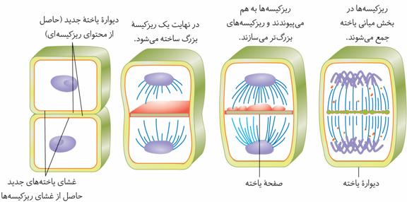 در یاختههای گیاهی، حلقه انقباضی تشکیل نمیشود. در این یاختهها نخست ساختاری به نام صفحه یاختهای در محل تشکیل دیواره جدید، ایجاد میشود. این صفحه با تجمع ریزکیسههایدستگاه گلژی و بههم پیوستن آنها تشکیل میشود. این ریزکیسهها، دارای پیشسازهای تیغه میانی و دیواره یاختهاند. با اتصال این صفحه به دیواره یاخته مادری دو یاخته جدید از هم جدا میشوند. ساختارهایی مانند لان و پلاسمودسم در هنگام تشکیل دیواره جدید، پایهگذاری میشوند.